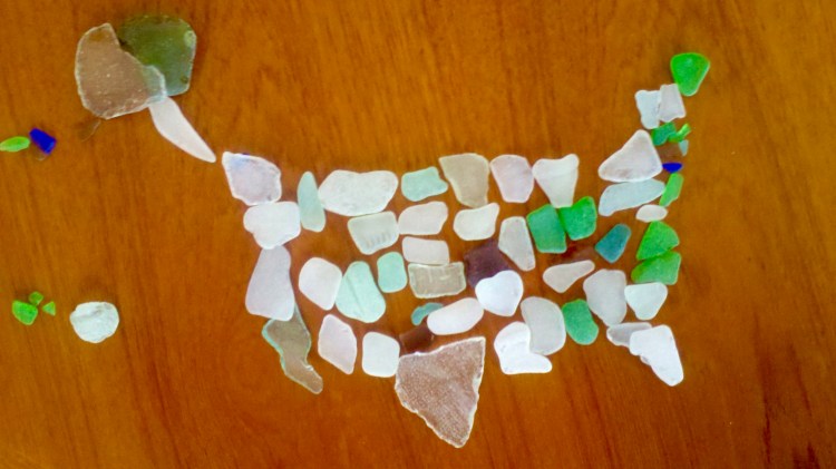 Sometimes, when I get my beach glass home, I create tiny mosaics from the pieces I’ve gathered: a brontosaurus, a dog with flappy ears, a human foot, a prehistoric fish, an elephant, a turtle. One time, I created a map of the US in beach glass, each state a separate piece. Oh, yeah, I had just retired and had time to devote to this whacky timewaster. But like Tibetan sand paintings, as soon as it was finished, I swiped all the pieces off the dining room table and put them into a glass [ahem!] jar. Reminder of both the eternal and ephemeral nature of life. Zen from start to finish.